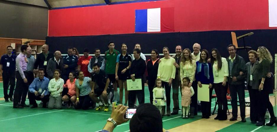 Arriba: Erik Betancourt (Presidente Asoc. Bádminton DF), José Luis González, Lorenzo Ruiz, Javier Orozco (Presidente Femeba), Oscar Lujan Jr., Bernardo Monreal, Gabriela Melgoza, Salvador Sánchez, Fernando de la Torre, Arturo Hernández, Cynthia González, Nydia González, Roy Díaz González, Veronica Estrada, Palazuelos Hija, Eduardo Palazuelos, Melissa Palazuelos, Esposa Jorge Palazuelos, Pepe Icaza, Palazuelos hija, Palazuelos Hermano, Palazuelos Mamá, Thelma Lazcano (Presidente Bádminton Club France). Abajo: Luis Lopezllera, Haramara Gaitan, Marisol Dominguez, Naty Rangel y Lino Muñoz. No estaban en el momento de la foto, pero asistieron al evento - Andres López, Ma. de la Paz Luna, Mónica Rivera y Gustavo Mere.